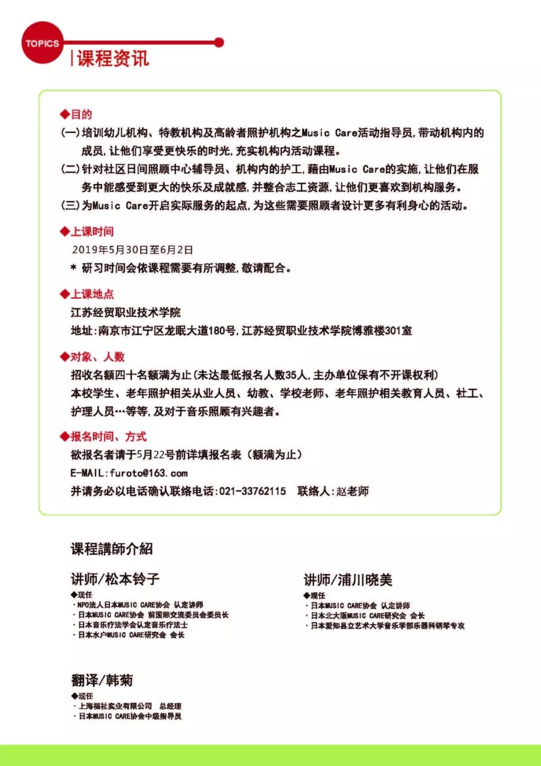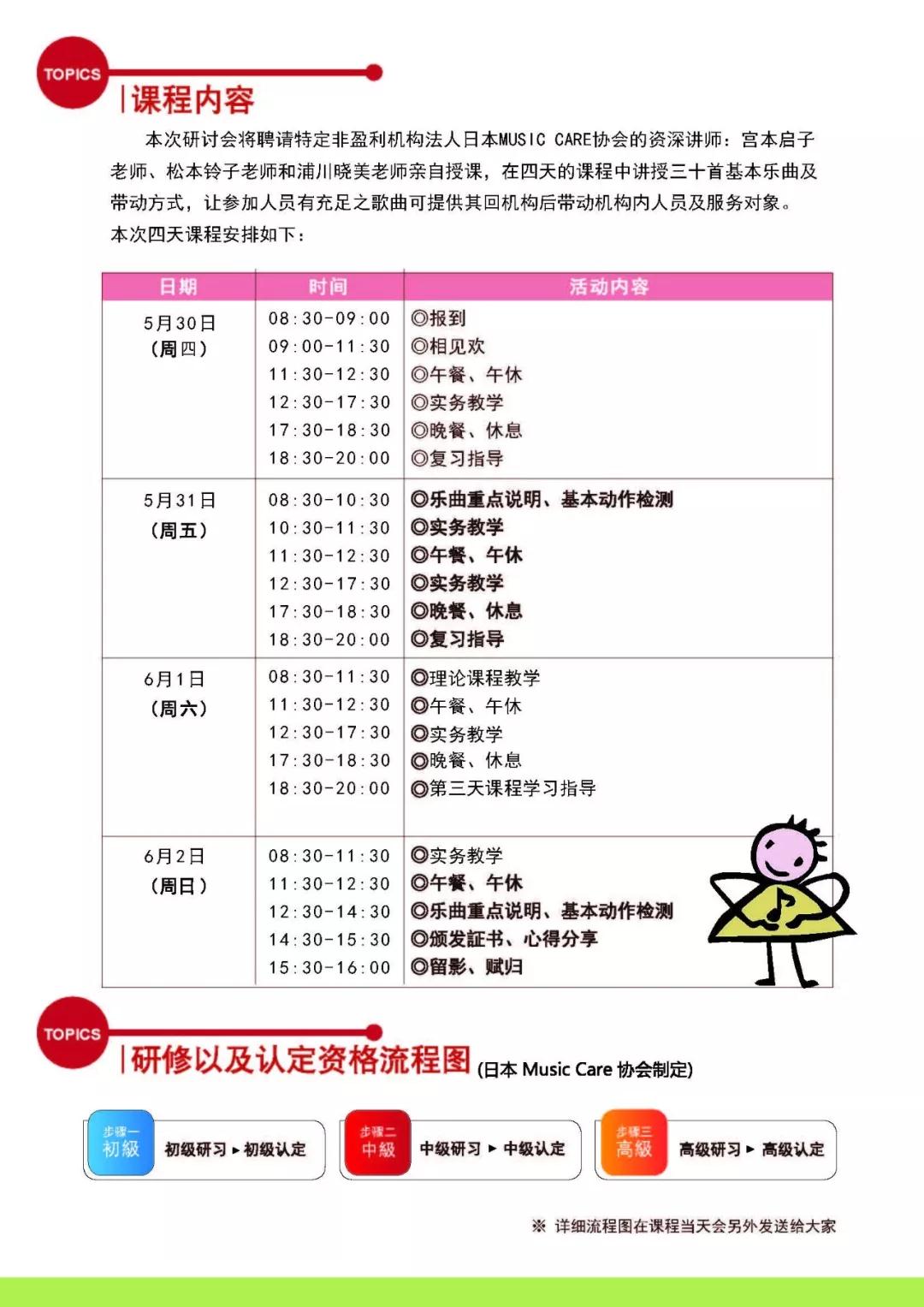 (报名本次课程的学员可在6月3日免费旁听日本老师对老学员实务带动情况的指导和点评,对新学员未来开展音乐照顾带动帮助很大,机会难得哟~)